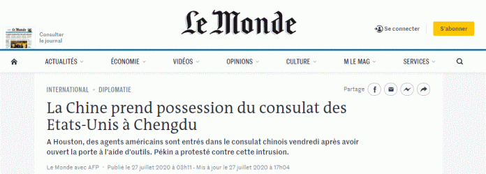 Sur les Ouïghours, on a par exemple appris que la Chine pratiquait des stérilisations forcées sur les femmes, volait puis revendait des organes, que le ramadan était interdit, que des mosquées et des tombes étaient détruites. On a aussi appris que TikTok espionne les mineurs d’âge, que la Chine cyberespionne une entreprise belge, que le coronavirus est une arme biologique employée par le parti communiste, que la Chine « interdit la réincarnation » et les films sur les voyages dans le temps (voir l’émission du 11/08 sur La Première RTBF), que la Chine désinforme sur le coronavirus, que la Chine s’ingérerait dans l’élection présidentielle aux USA, que la Chine « impose sa propagande sur les réseaux sociaux », que la répression fait rage à Hong-Kong, qu’on y empêche les Catholiques de prier, que la Chine prend « possession du consulat des USA à Chengdu » (et tant pis si l’info est incroyablement trompeuse, je vous en laisse juge avec la capture d’écran  du Monde du 27/07 ci-dessous lisez le titre…puis le chapeau !).