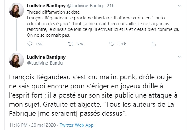 [EDIT 21/05/2020] Parfois je me dis que je devrais checker le passif de chaque mec dont je parle avant de le relayer #Assange, tant la norme semble être le « sexisme jusqu’à preuve du contraire » Voici donc la petite saillie « c’est de l’humour, hein » de Bégaudeau :